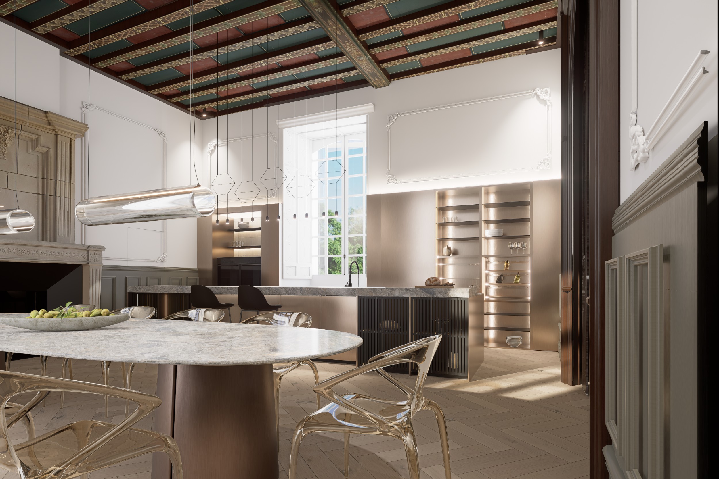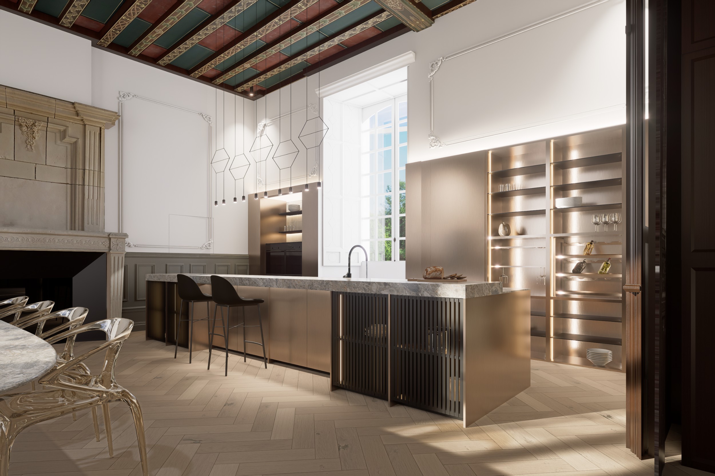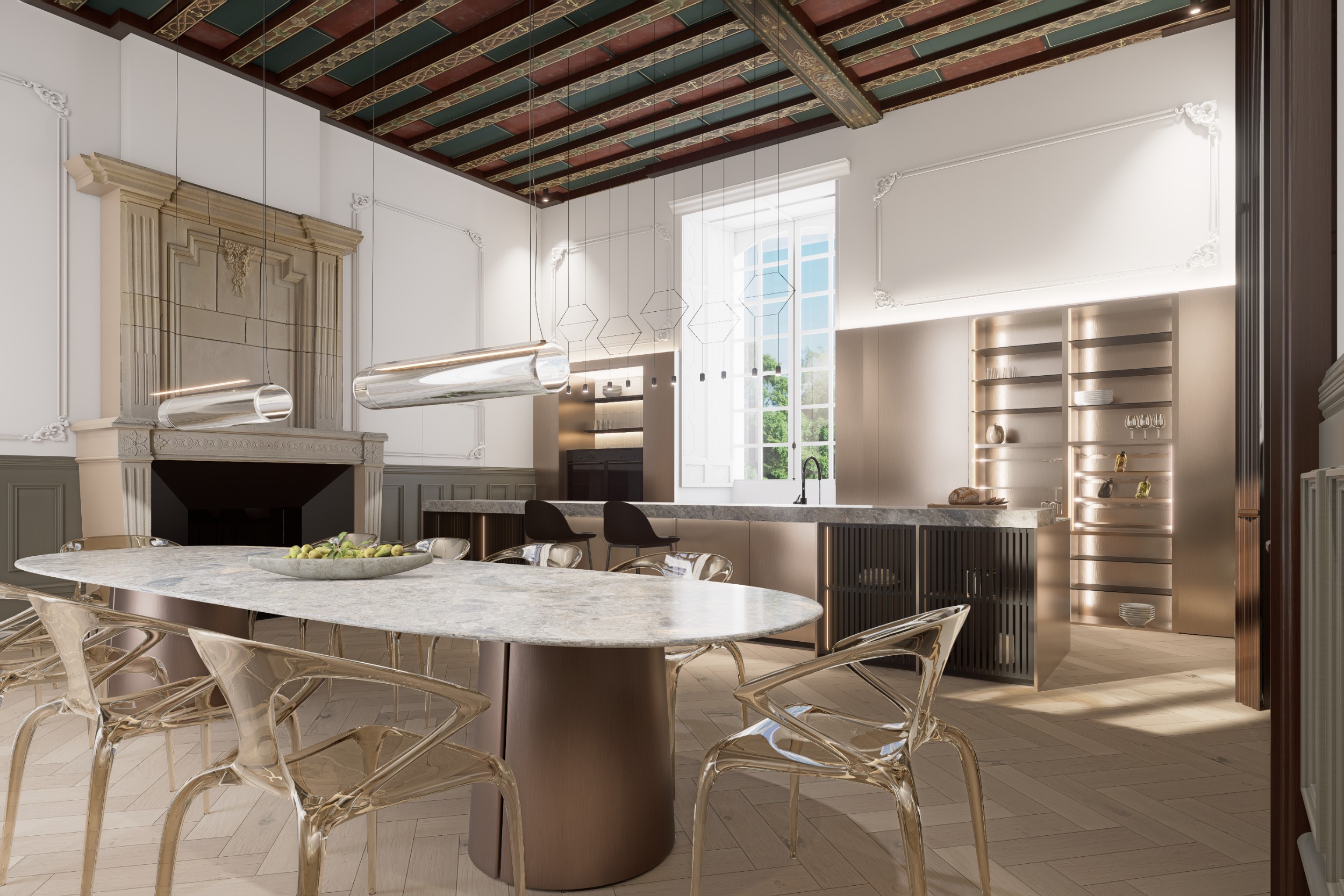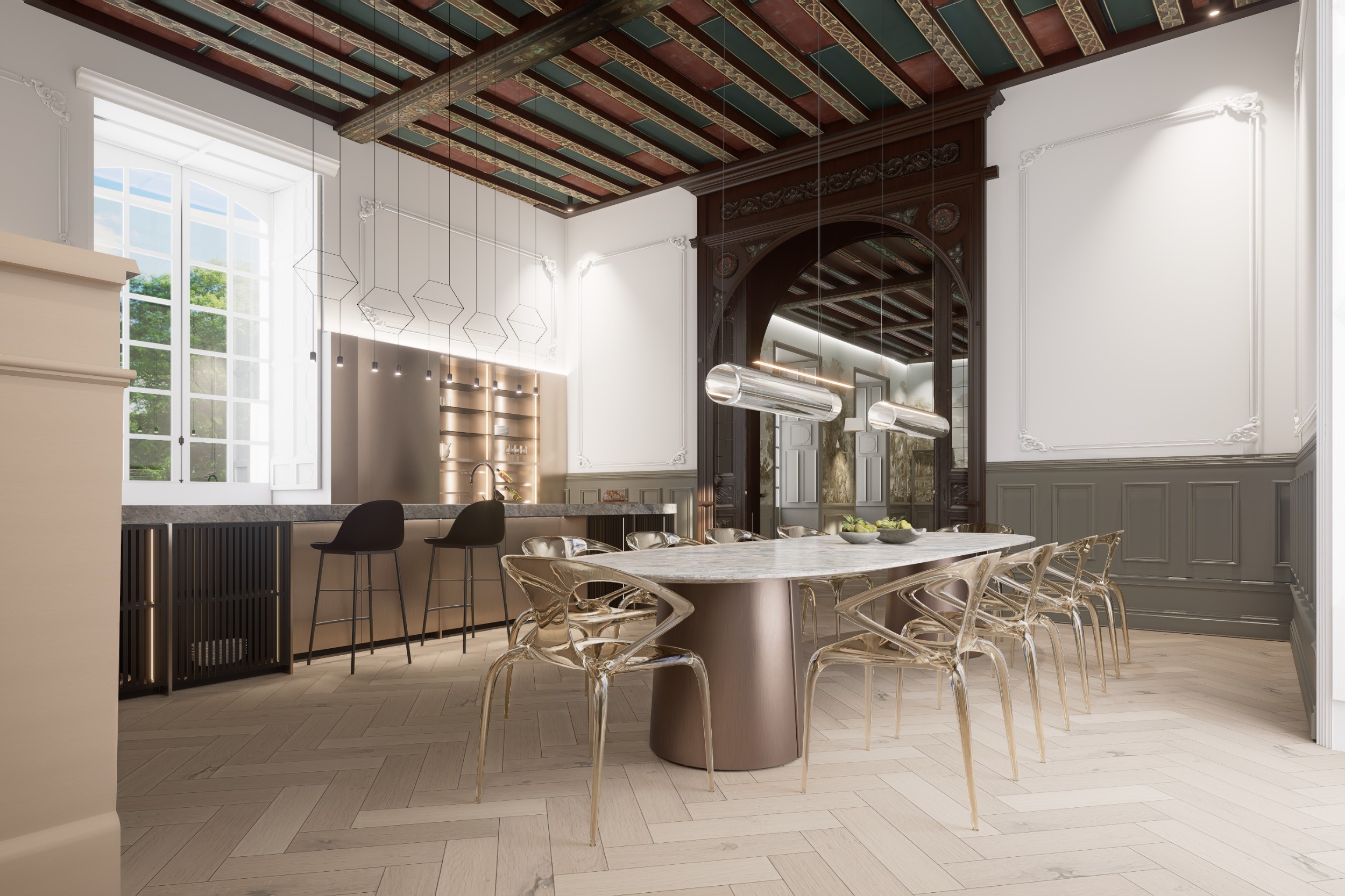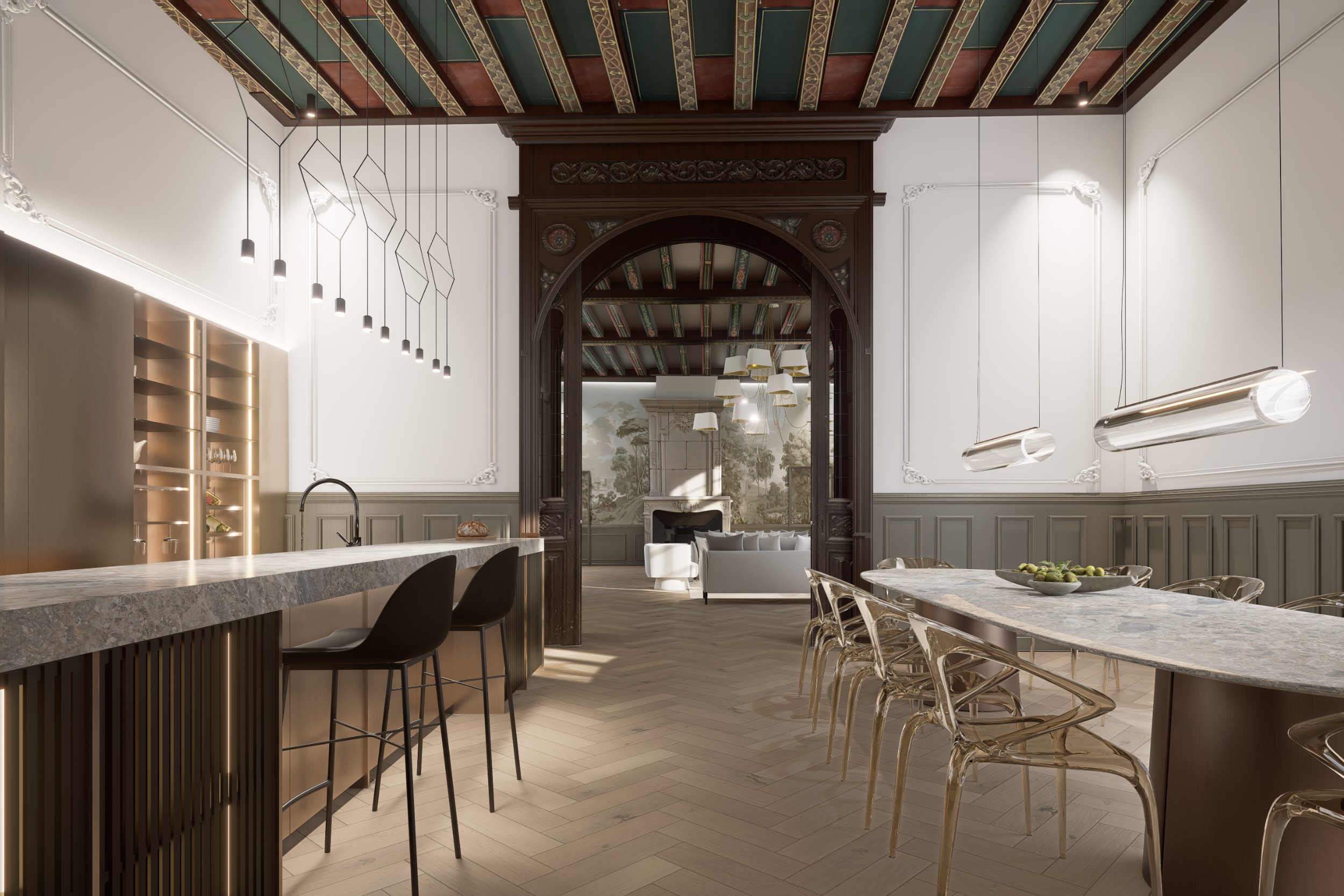 Rénovation complète d'un salon et d'une cuisine au sein d'un château de style Art Nouveau. Le projet met à l'honneur des matériaux nobles et des savoir-faire traditionnels, tout en intégrant une cuisine italienne contemporaine haut de gamme pour créer un ensemble à la fois authentique et raffiné.
