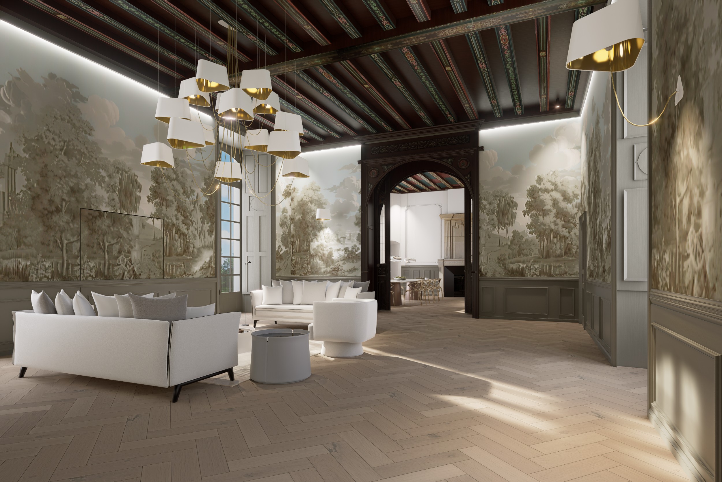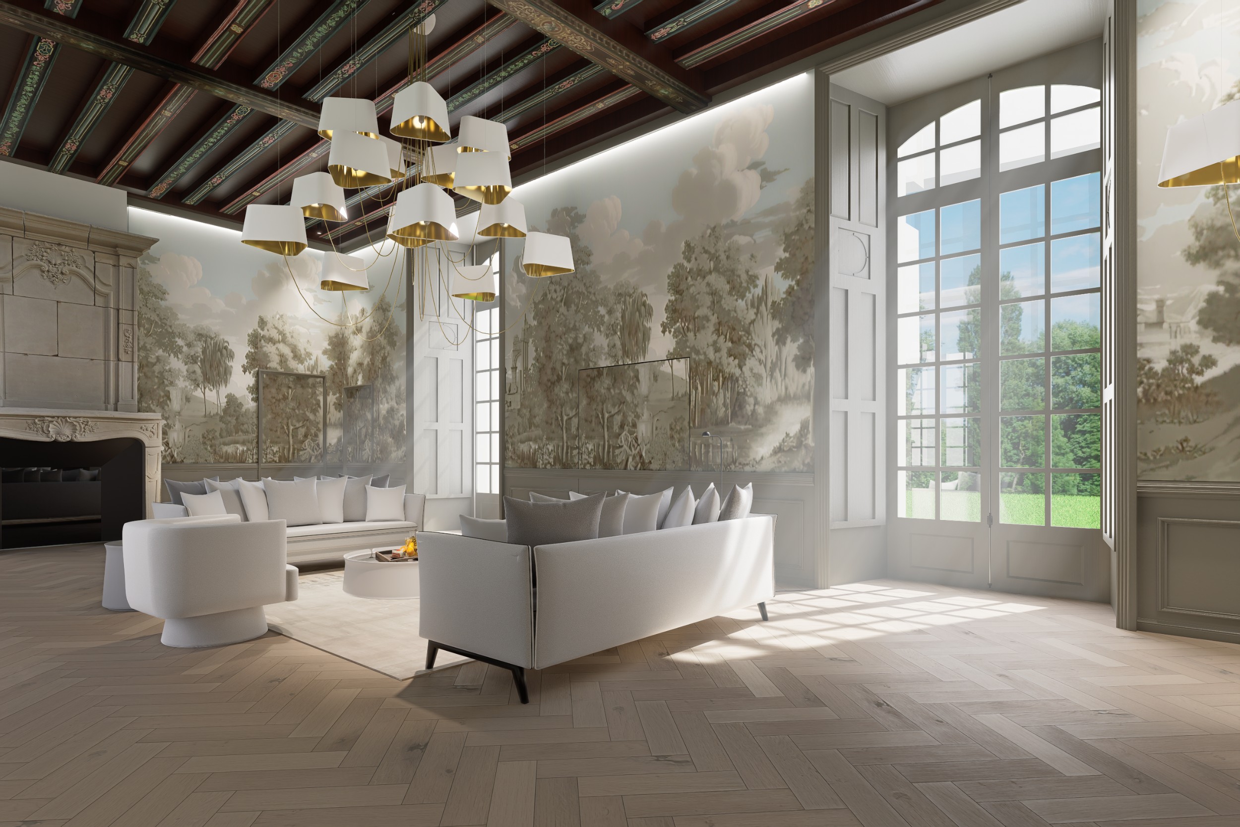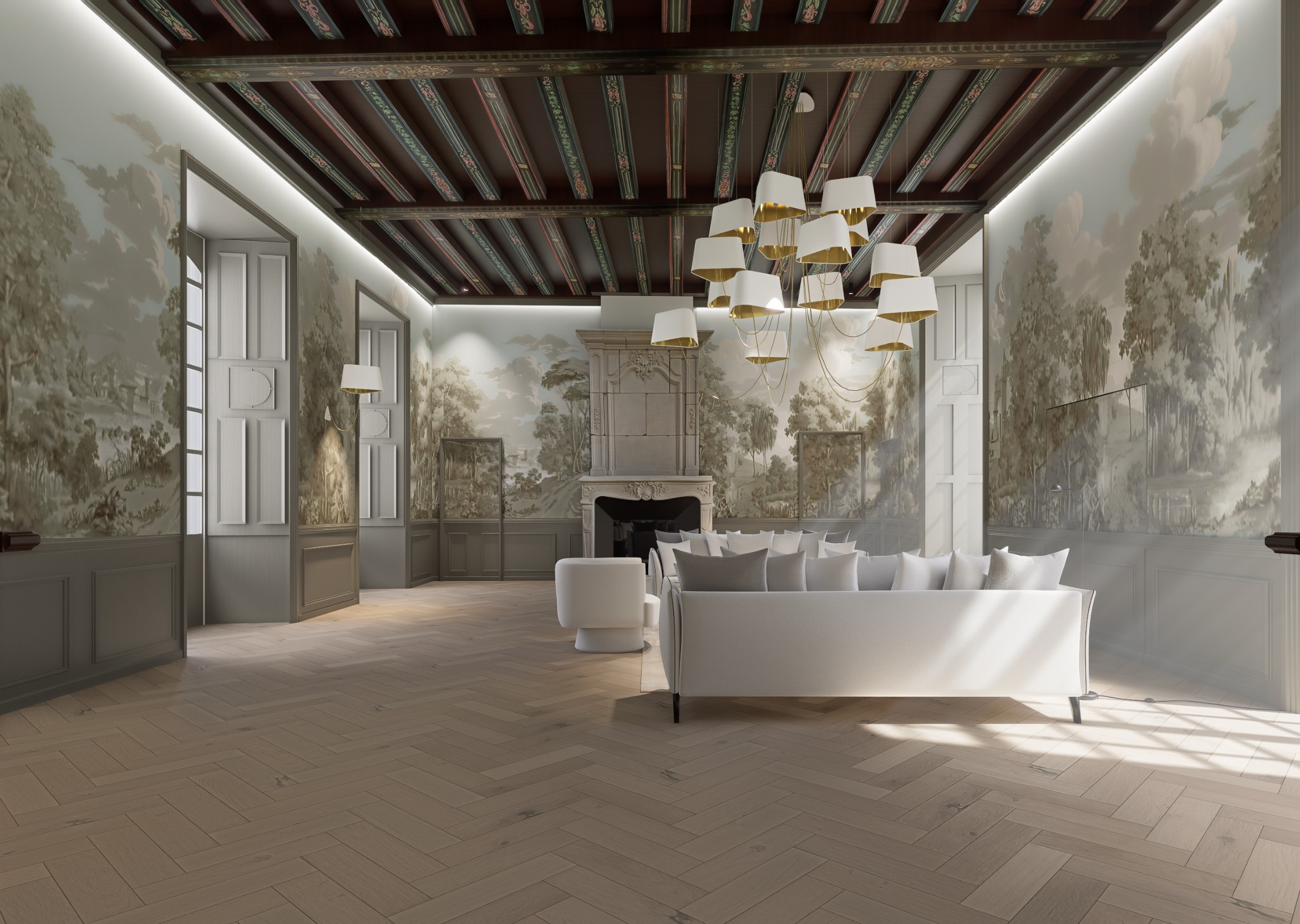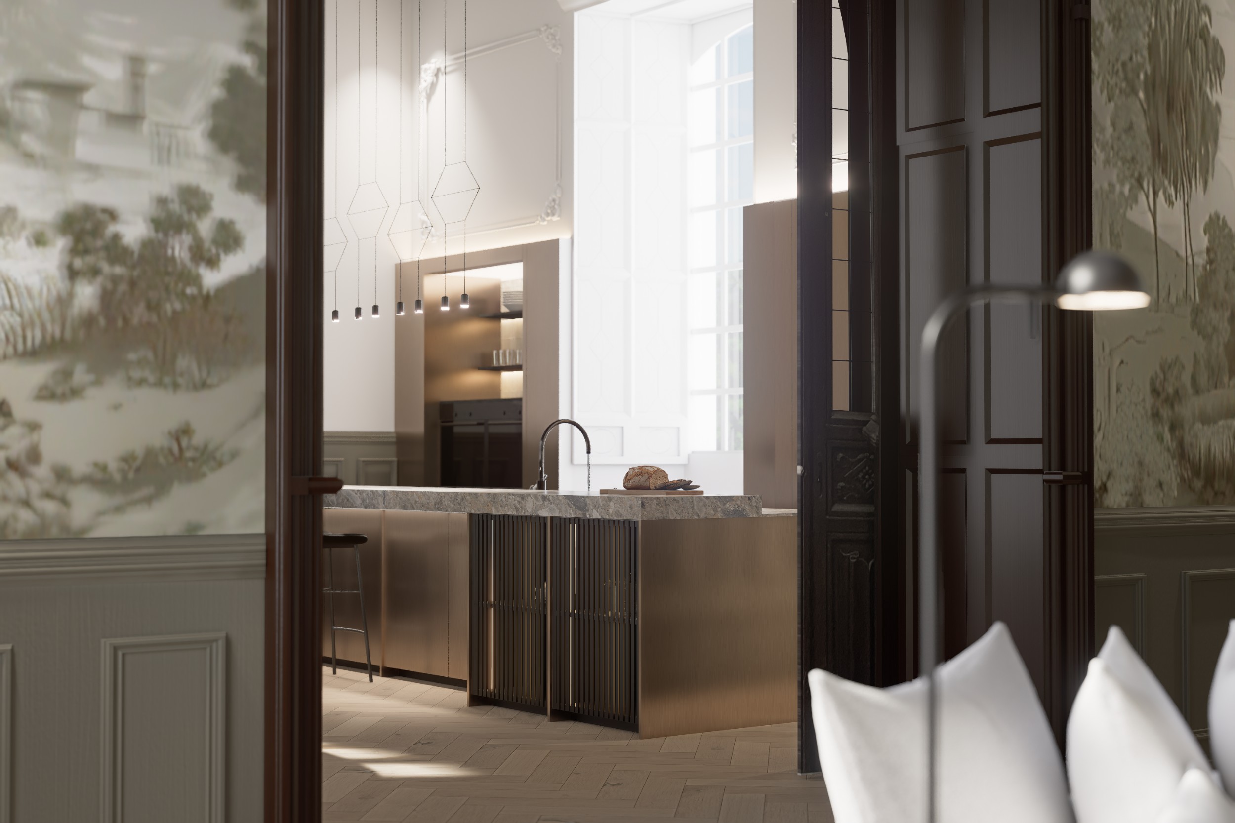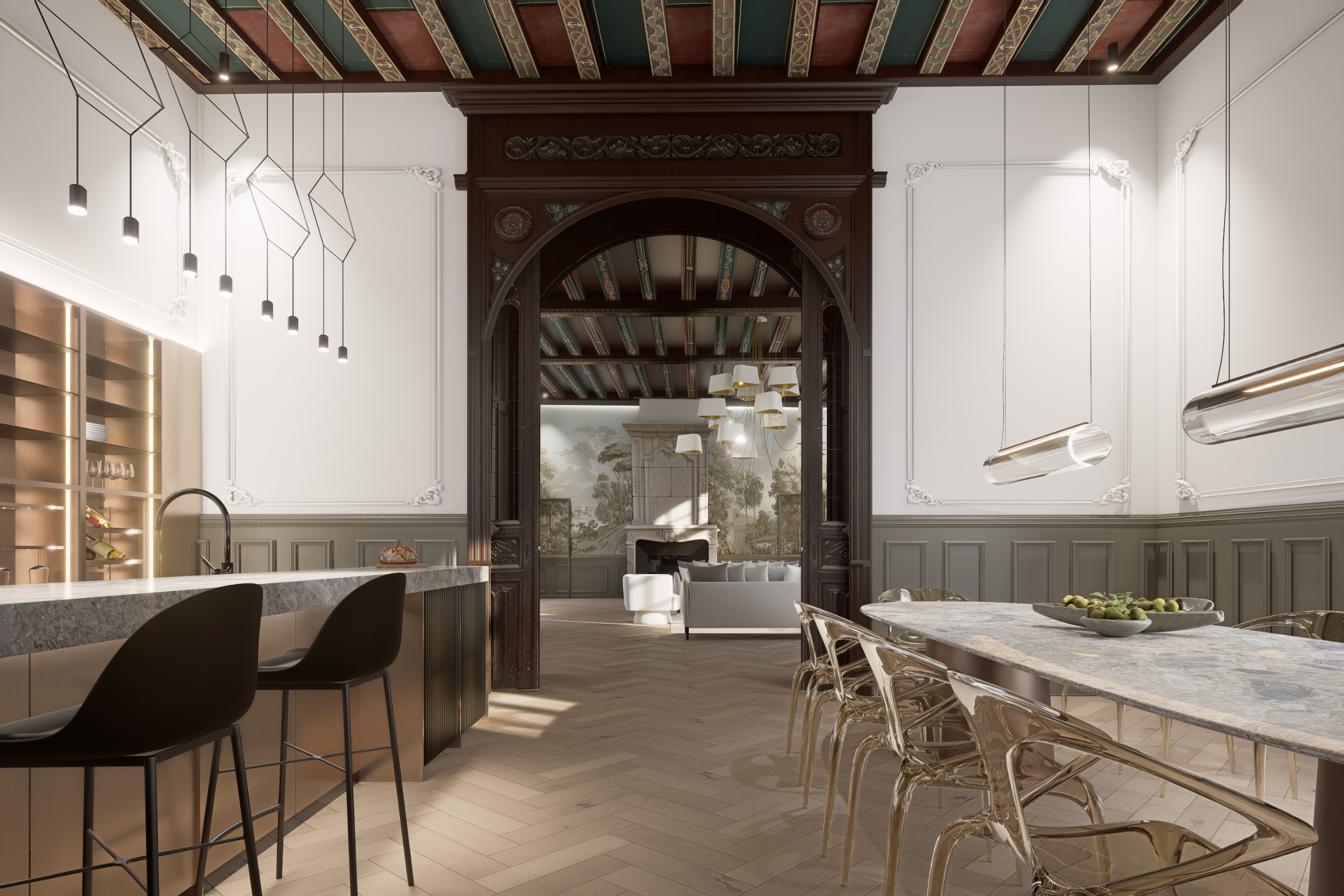 Rénovation complète d'un salon et d'une cuisine au sein d'un château de style Art Nouveau. Le projet met à l'honneur des matériaux nobles et des savoir-faire traditionnels, tout en intégrant une cuisine italienne contemporaine haut de gamme pour créer un ensemble à la fois authentique et raffiné.