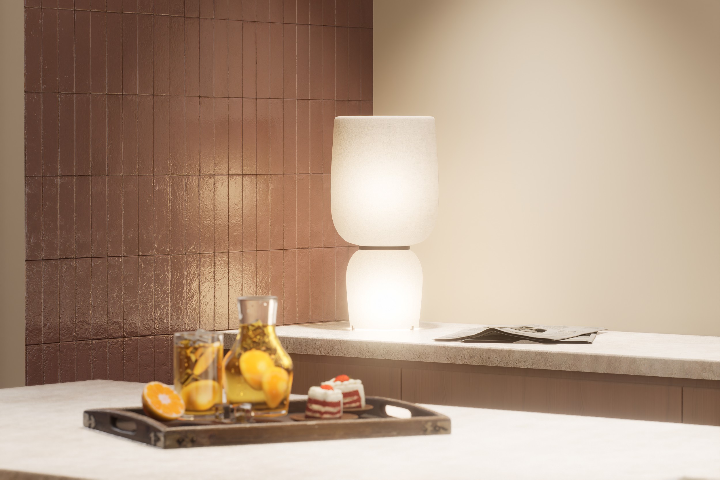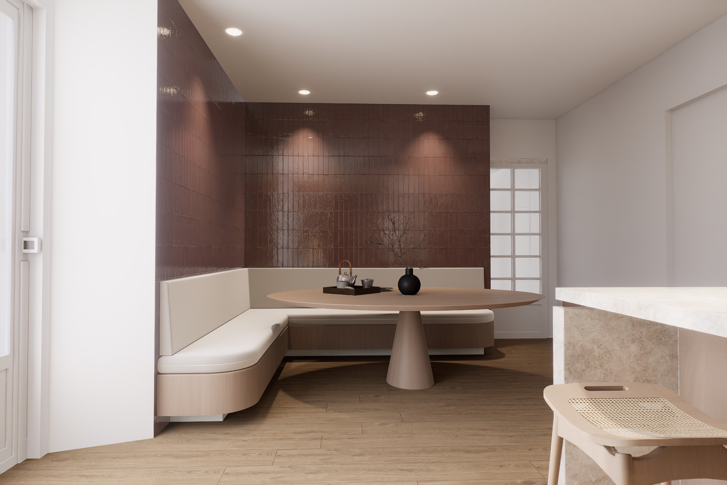 Style moderne et épuré. Utilisation de couleurs franches et contrastées. Faïences originales apportant rythme et identité à la pièce.