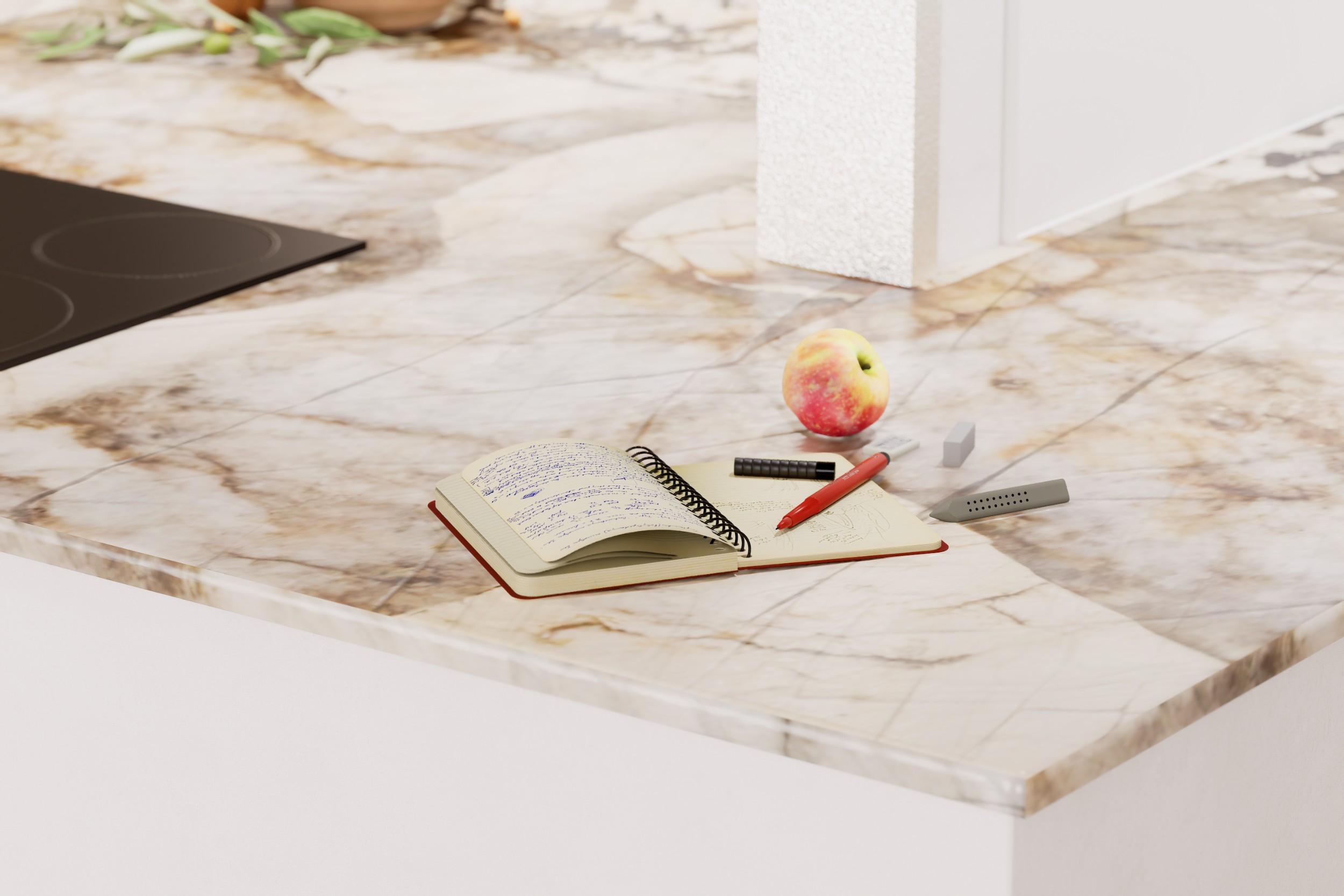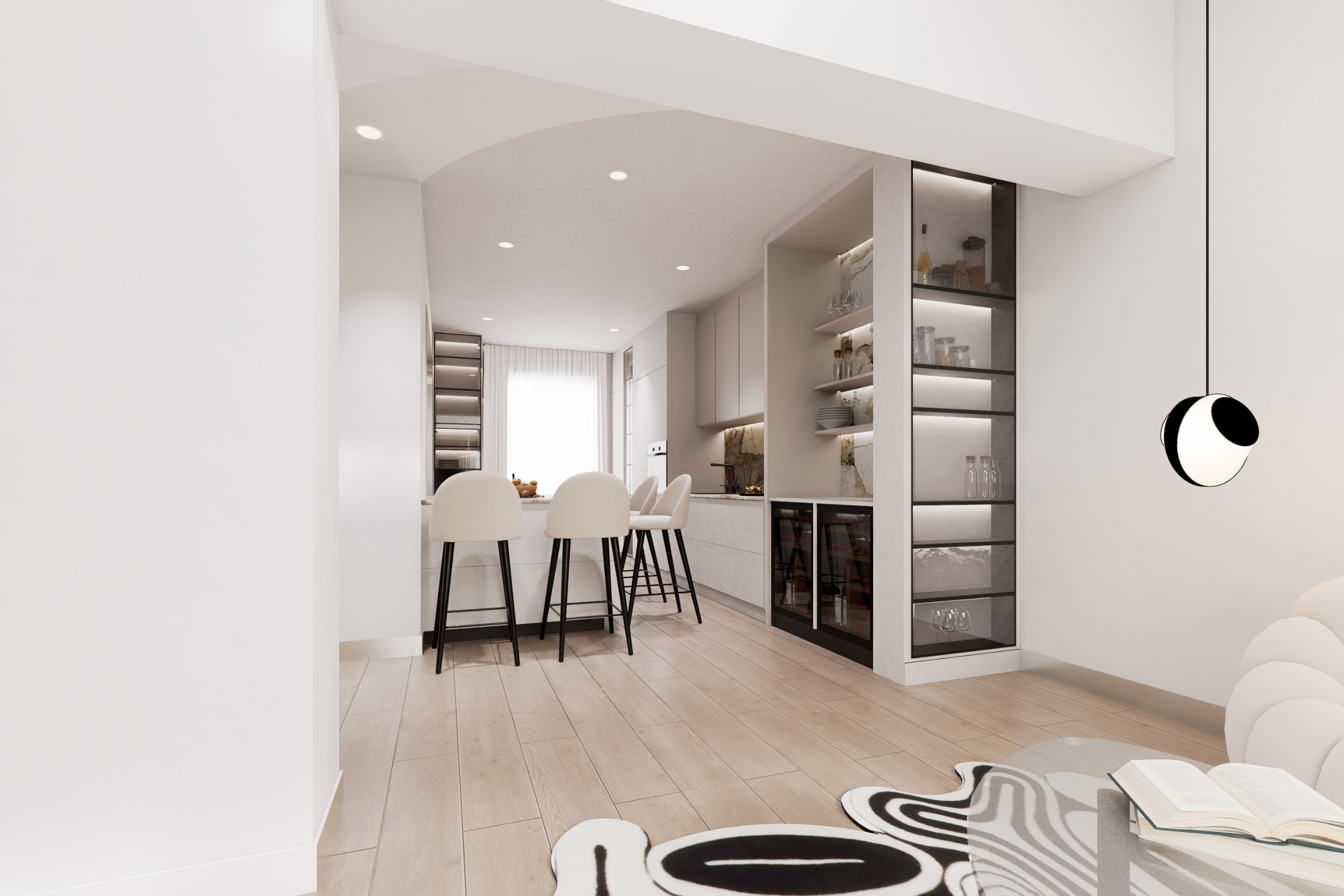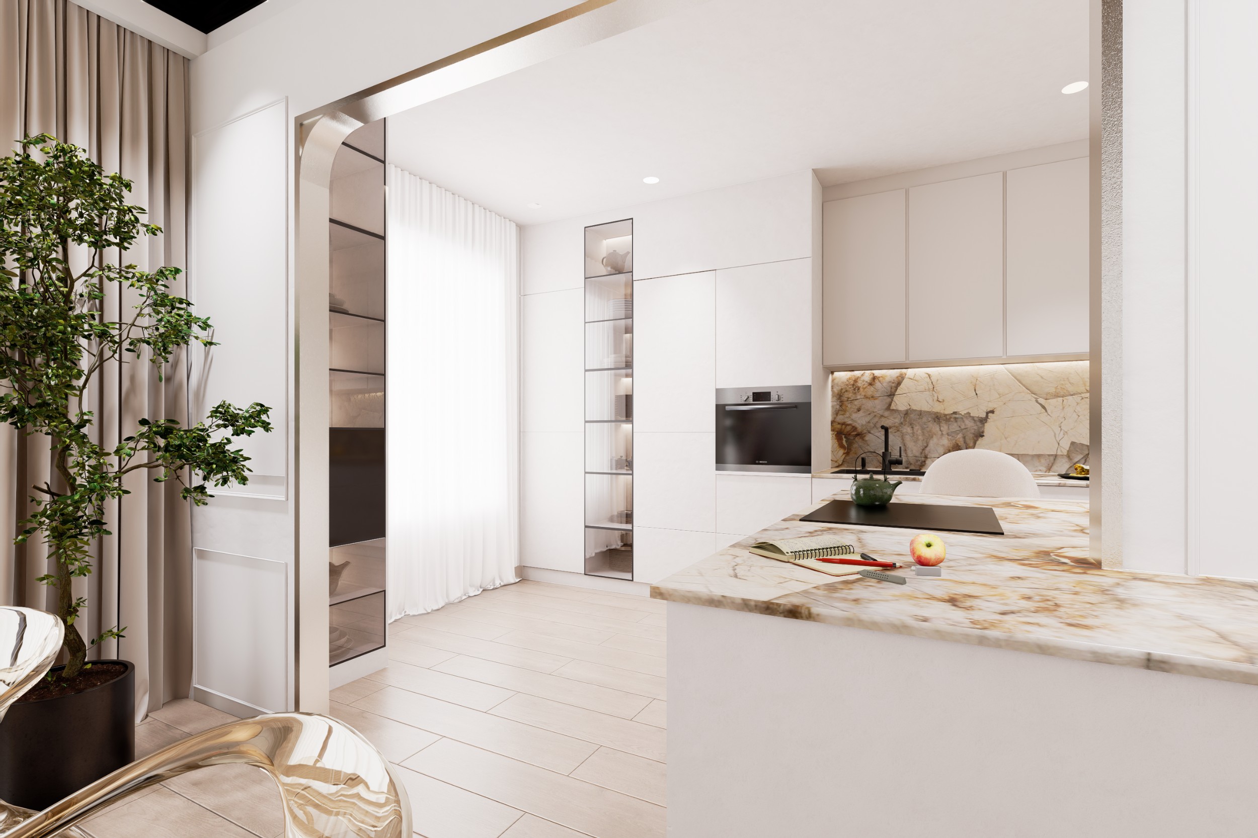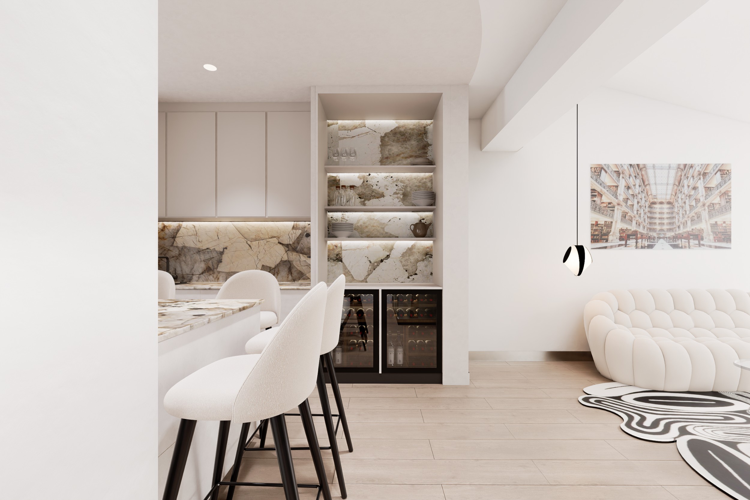 Projet conceptuel d'une cuisine haut de gamme, imaginée autour de matériaux d'exception et d'un design épuré et contemporain. L'espace met en valeur le granit Patagonia, une pierre naturelle spectaculaire qui devient l'élément central de la composition.